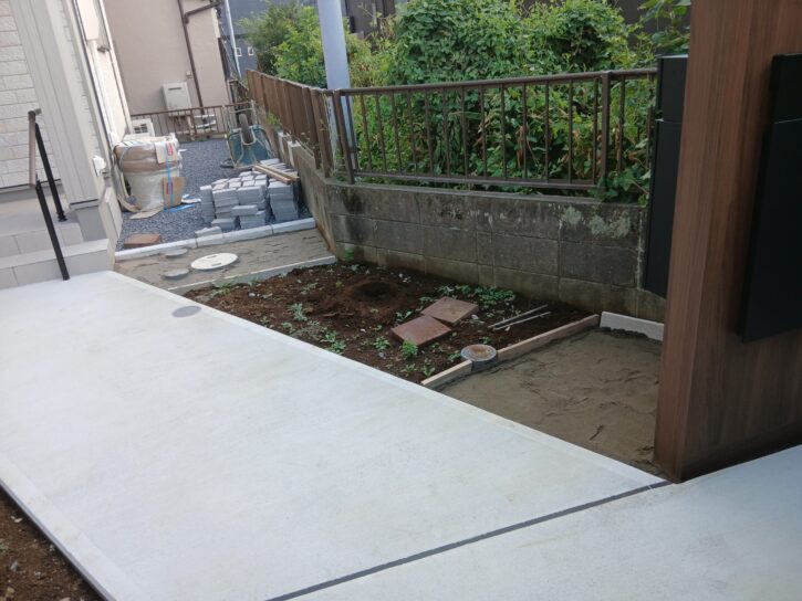 インターロッキングを並べます。まず、鋤取りを行い、砕石と砂を敷きました。