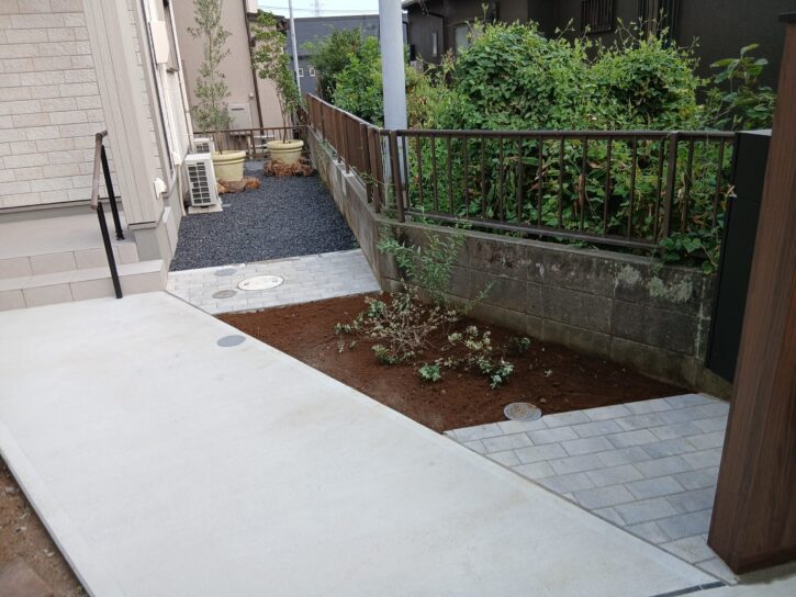 インターロッキングを敷きました。また、植栽を植え、周りに石を並べています。