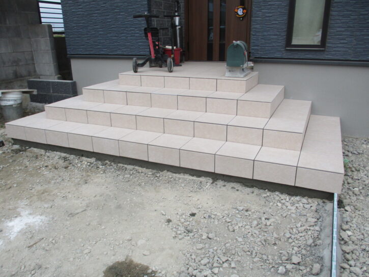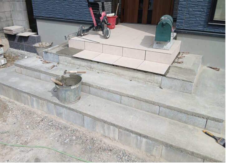 ブロックを積み、人工芝の下地の砂を敷きました。また、縁石やサイクルポートの柱を設置しました。 -
