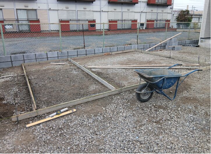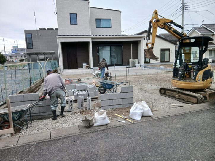 境界ブロックを積んでいます。また、砕石を敷いています。 -