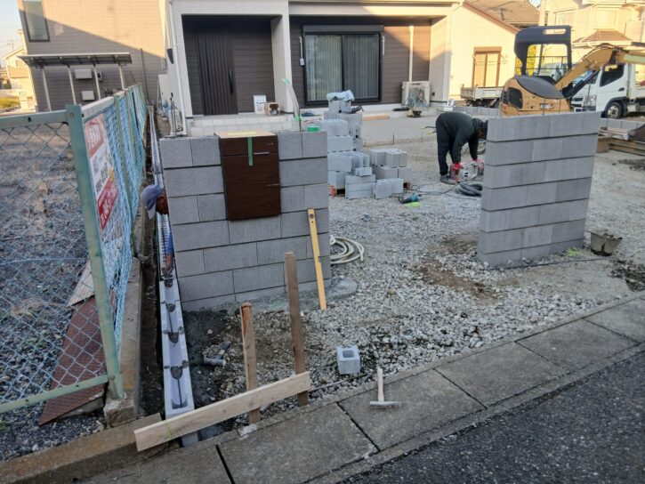 門柱にポストを取り付けました。また、境界のブロックの根付けを行いました。 -