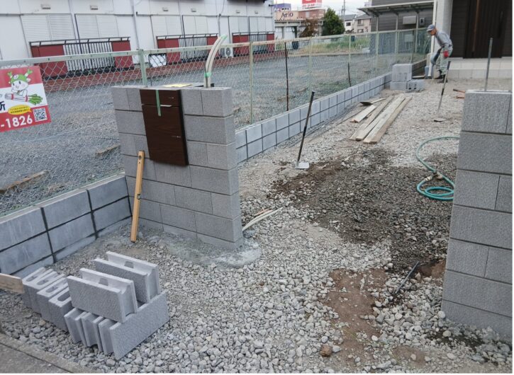 門柱の化粧ブロックを積んでいます。また、砕石を敷いています。 -