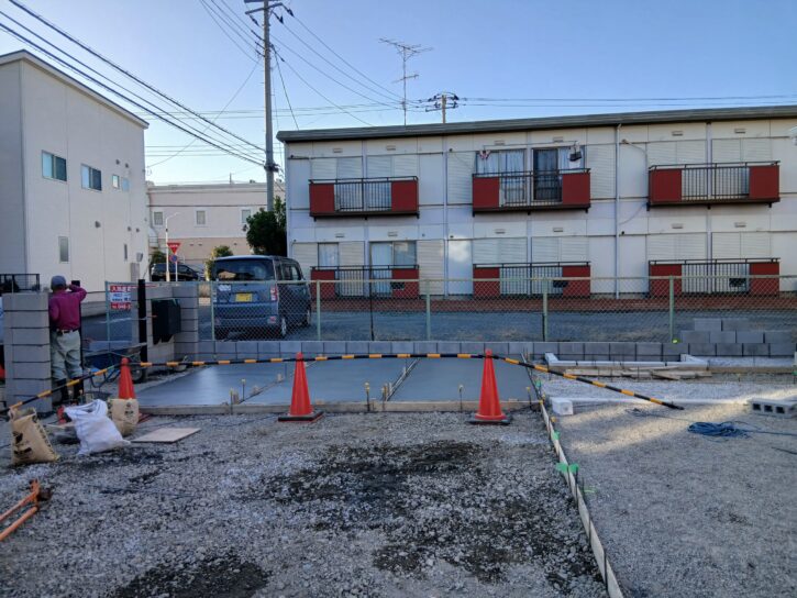 土間コンを打ちました。また、白砕石敷や縁石並べ等を行っています。 -