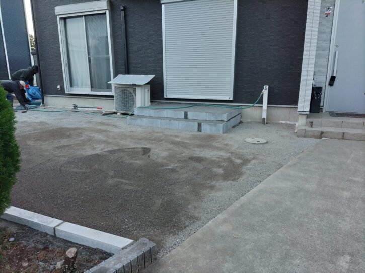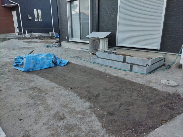 人工芝の下地を作っています。また、デッキのブロックを積んでいます。 -