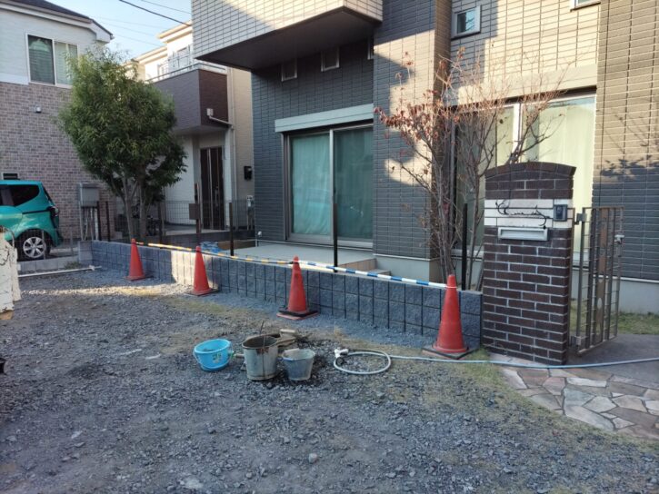 ブロックを積み上げました。その後、フェンスの柱を立て、天端を仕上げたり、土の埋め戻しを行いました。 -