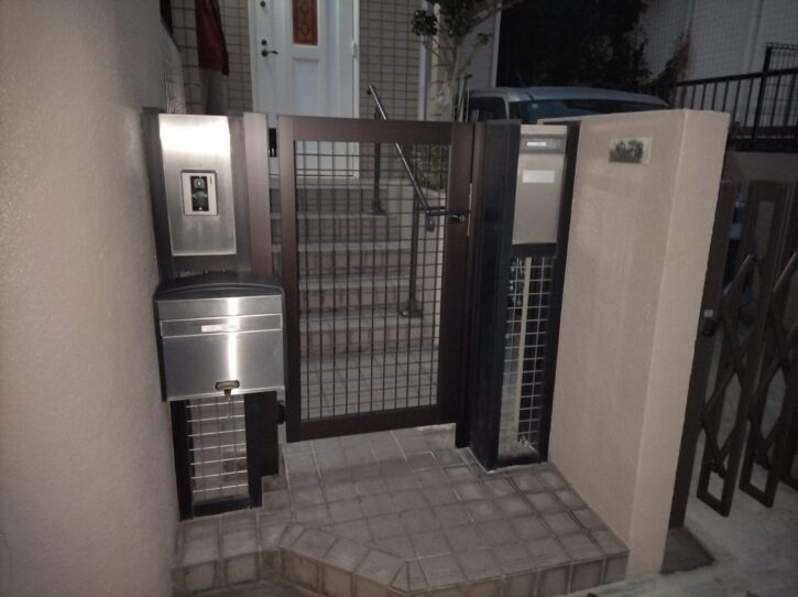 門扉とアコーディオンの本体を取り付けました。また、手摺りを設置しています。