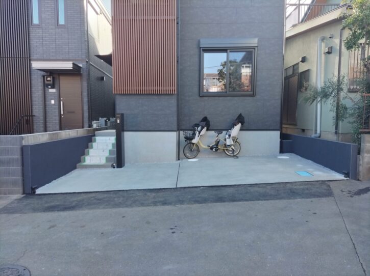 家の周りに白砕石を敷きました。また、木枠組みや伸縮目地、機能門柱の設置を行いました。