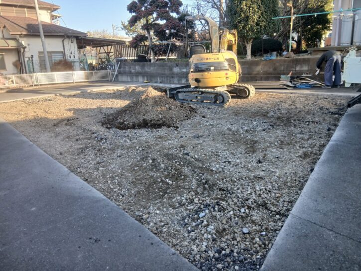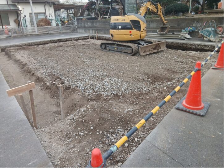 ガレージの鋤取りと基礎の根掘りを行いました。その後、砕石を敷き、転圧を行いました。